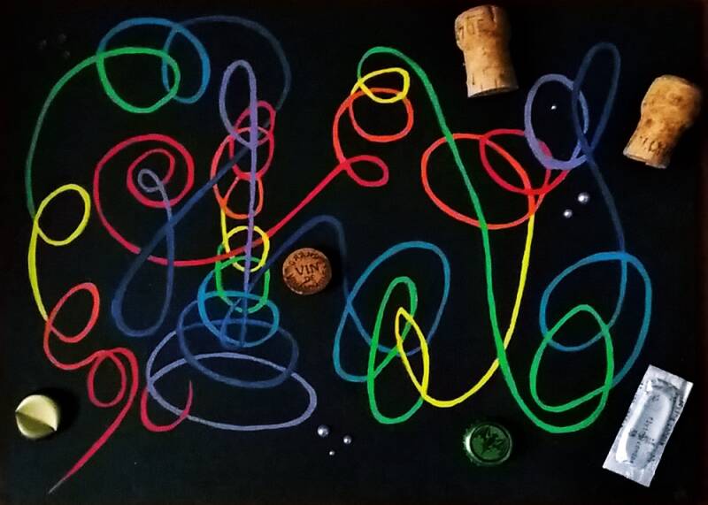 acrylic, bottle caps & cork, condom & strass on canvas board
